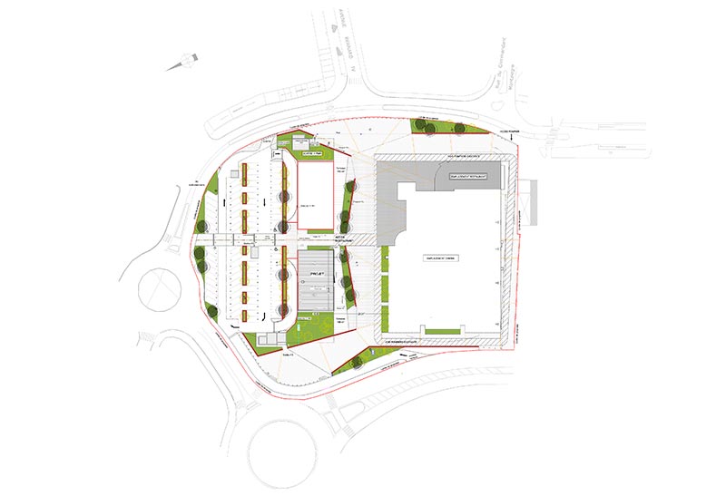 Réalisation d’un restaurant, à l’entrée Nord de Muret, qui s’intègre dans un ensemble urbain existant, composé d’un cinéma, d’un parvis, d’un parking aérien et souterrain de 210 places.
